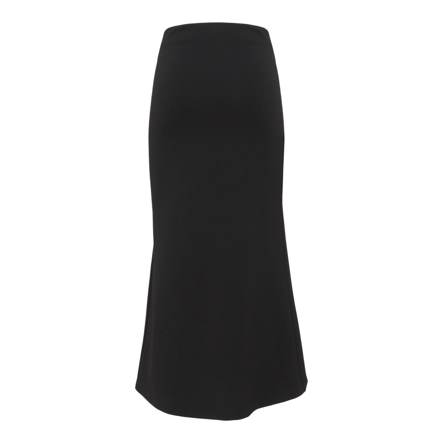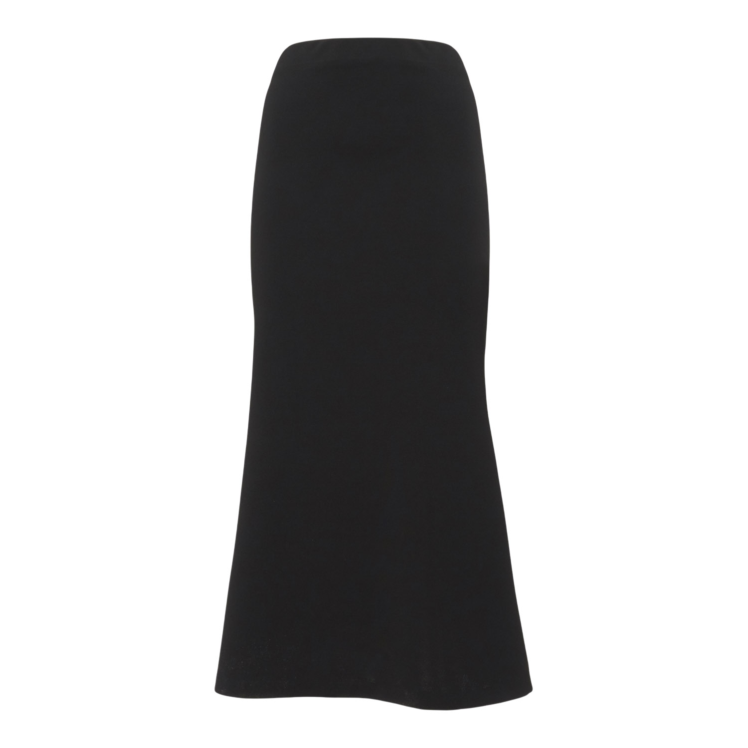 Elegant black midi skirt with a clean, elongated silhouette that softly flares at the hem. Timeless and refined, it offers effortless movement and versatility perfect for sophisticated looks from day to nigh