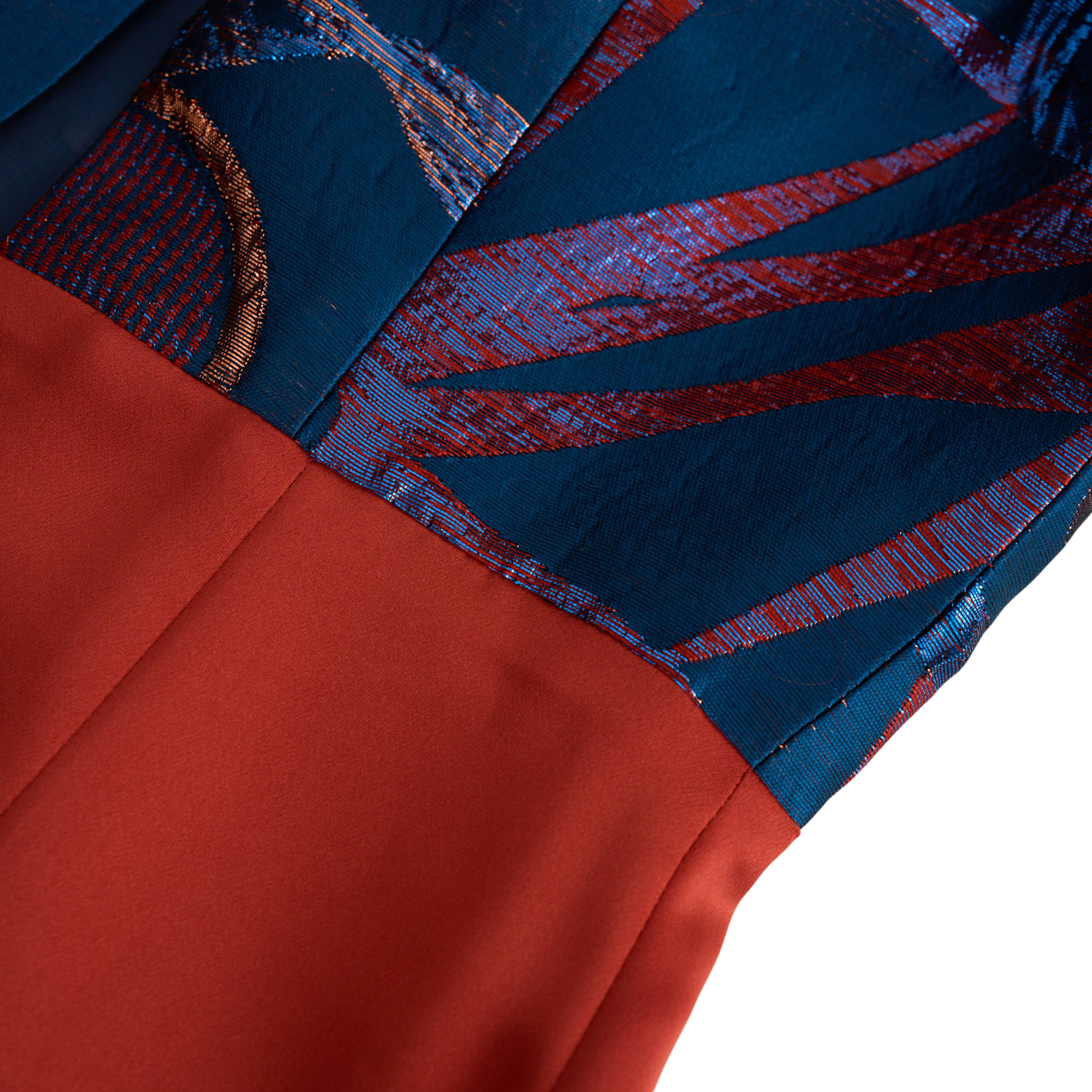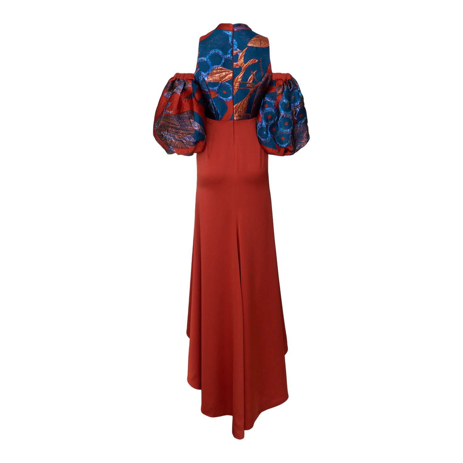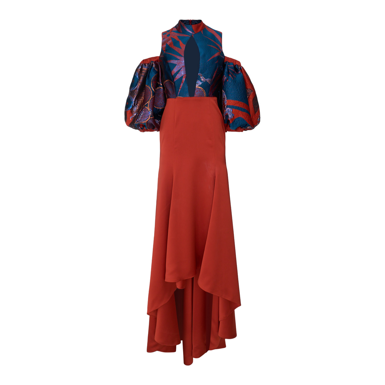 Maxi dress with a strong couture character, combining a fitted skirt in a terracotta hue with an asymmetrical, fluid hem and a striking bodice. Crafted from jacquard fabric in fiery red and deep sapphire tones with a subtle sheen, it features a high neckline, a cut-out detail at the décolletage, and voluminous sleeves that add drama and architectural elegance. Ideal for distinctive evening appearances of refined aesthetics.