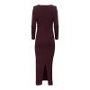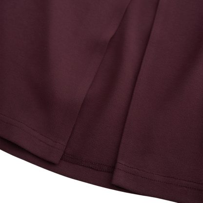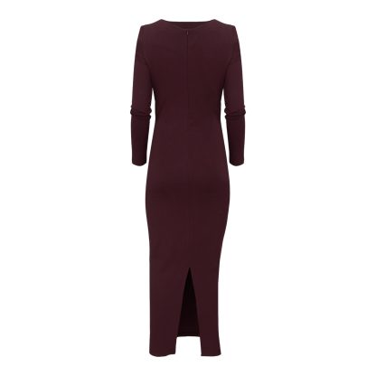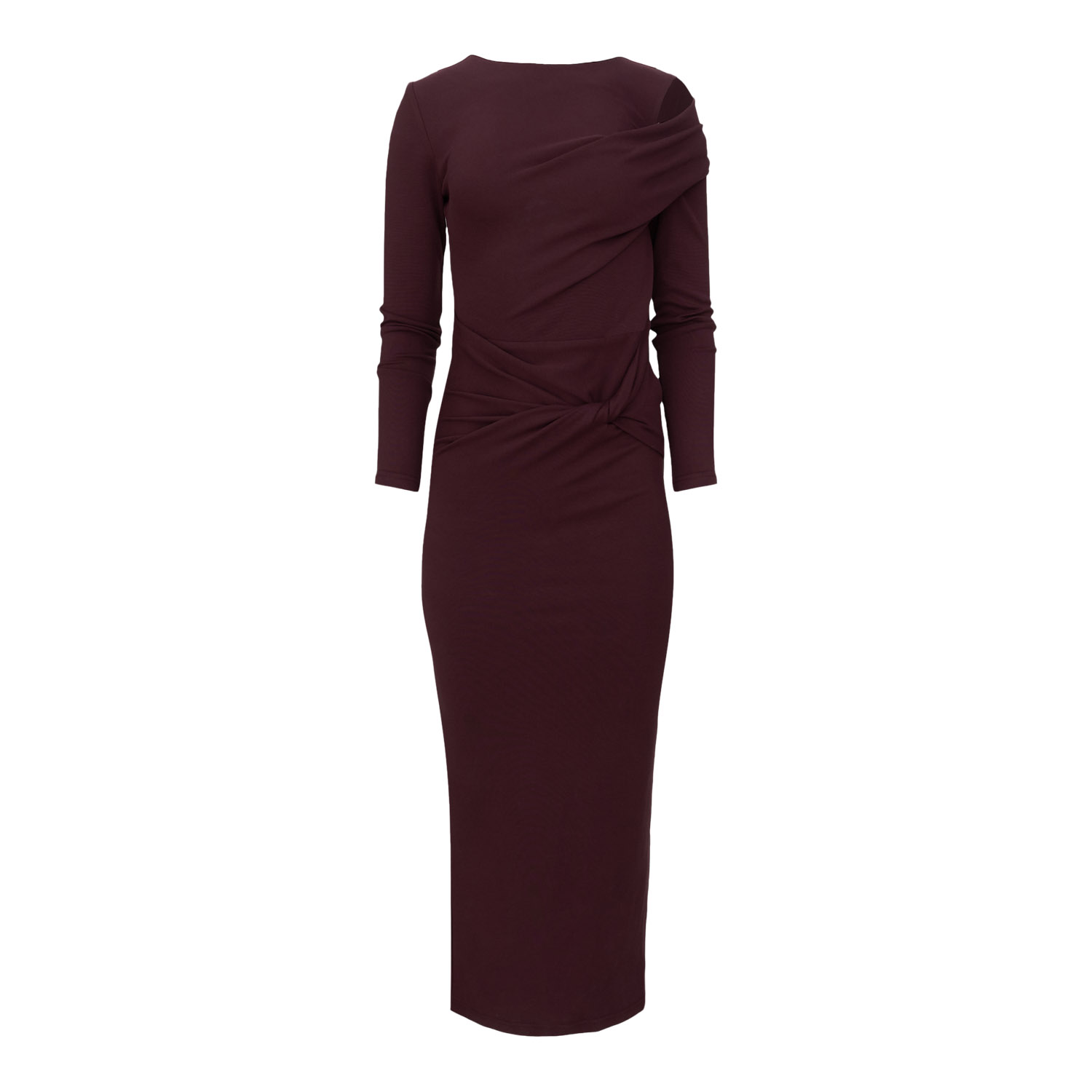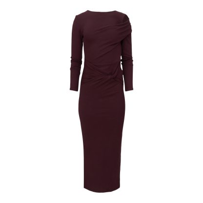 Long, fitted dress in a deep burgundy shade, featuring asymmetric draped lines that highlight the waist and silhouette. An elegant and contemporary design that exudes subtle luxury and dynamic femininity.