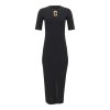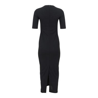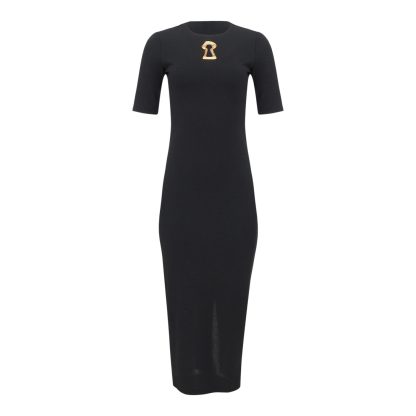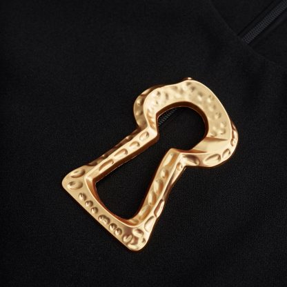 Elegant black midi dress with a sleek, body contouring silhouette and clean lines. The statement gold detail at the neckline adds a bold yet refined touch, creating a powerful piece perfect for sophisticated day-to-night looks.