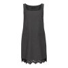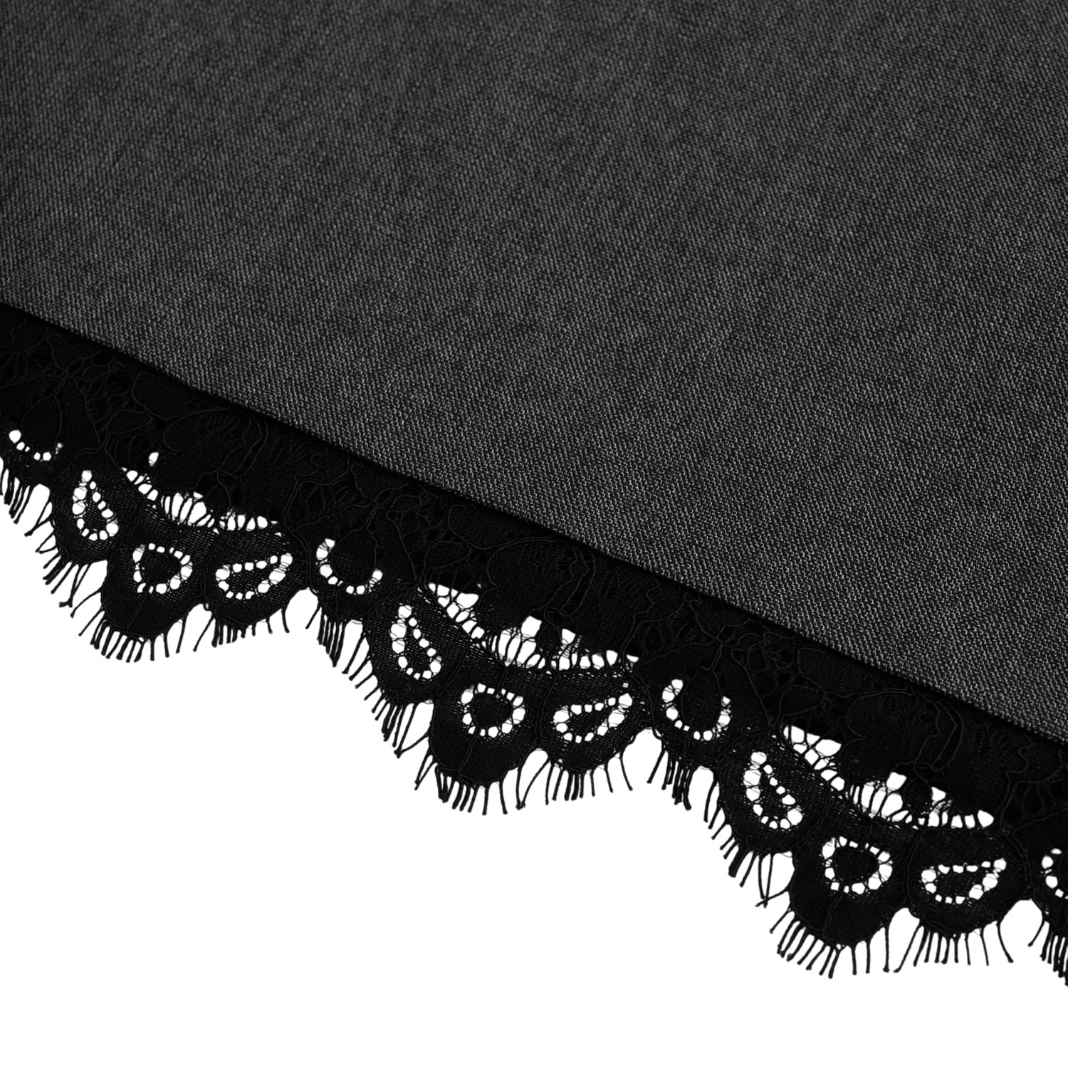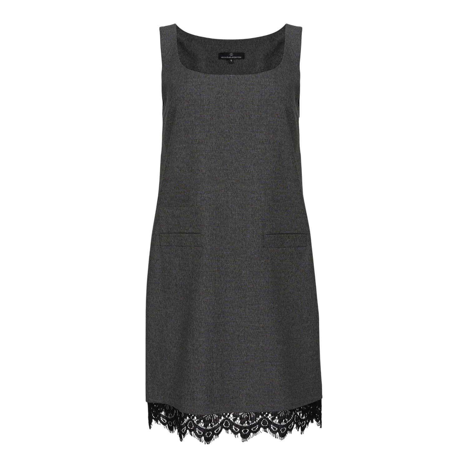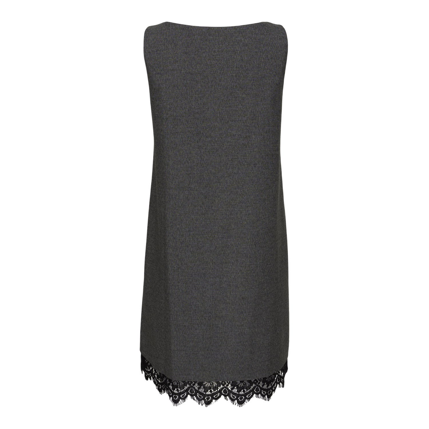 Grey dress defined by a clean, structured silhouette and timeless tailoring, subtly contouring the figure. The lace detail at the hem adds a feminine contrast, creating an elegant piece ideal for day-to-night looks.