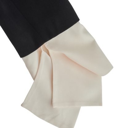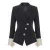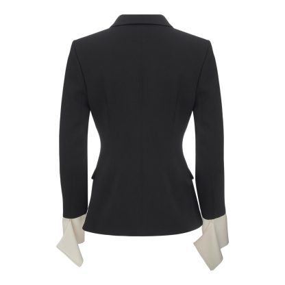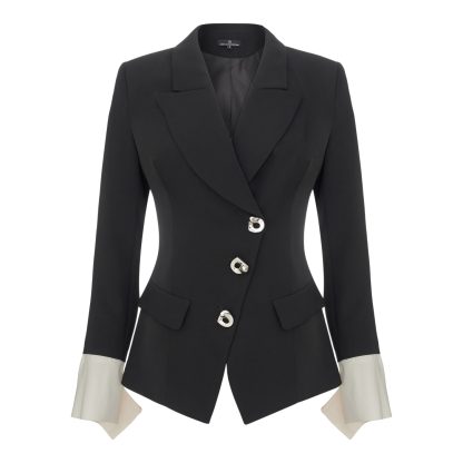 An elegant black tailored jacket that combines a flawless silhouette with contemporary detailing. Featuring an asymmetrical button closure with metallic buttons and subtle two-tone detailing on the sleeves, it stands as a statement piece of timeless strength and modern character.