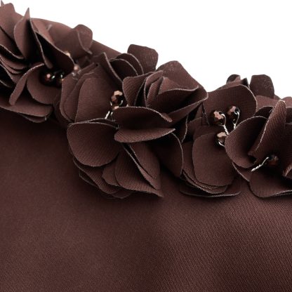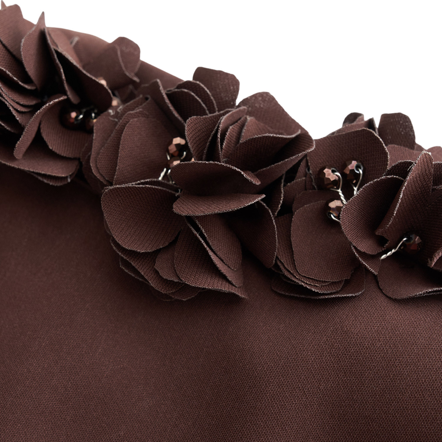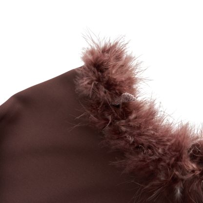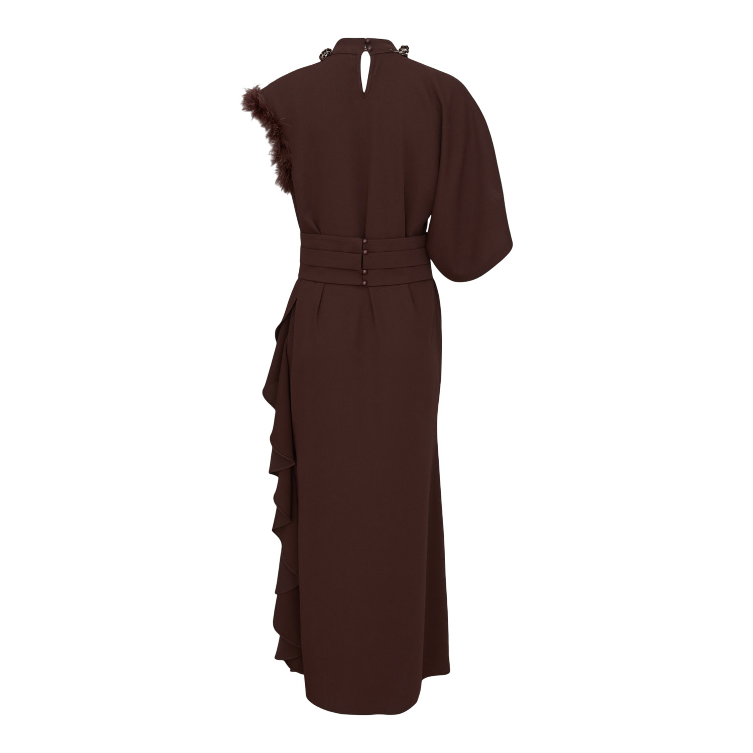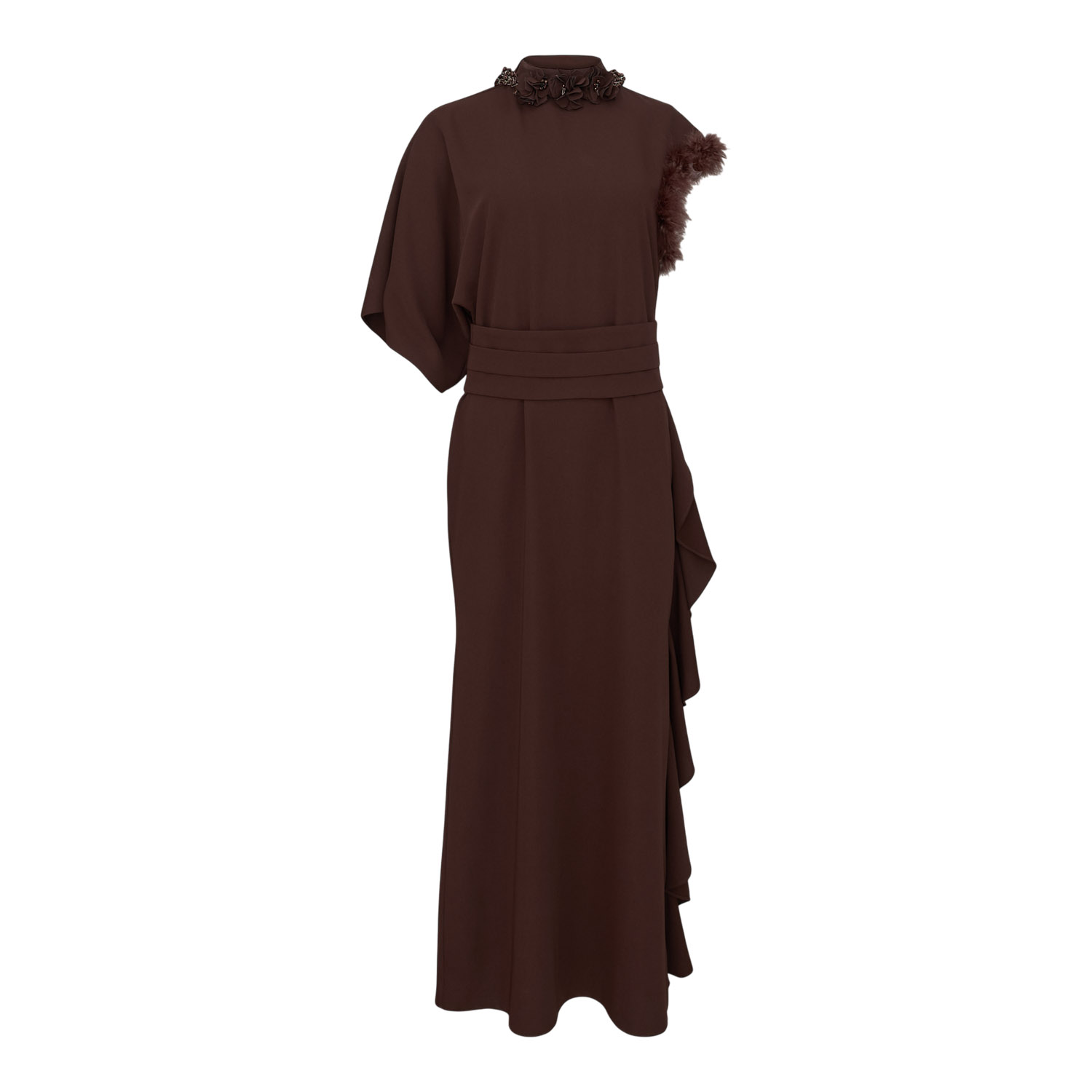 Long dress in a rich chocolate shade, featuring an asymmetric shoulder and a minimal silhouette that embraces the body. A subtle waist belt enhances femininity, while the distinctive feather detail on the shoulder and soft side ruffles add a sense of luxury and theatrical elegance. A true statement piece for formal occasions.