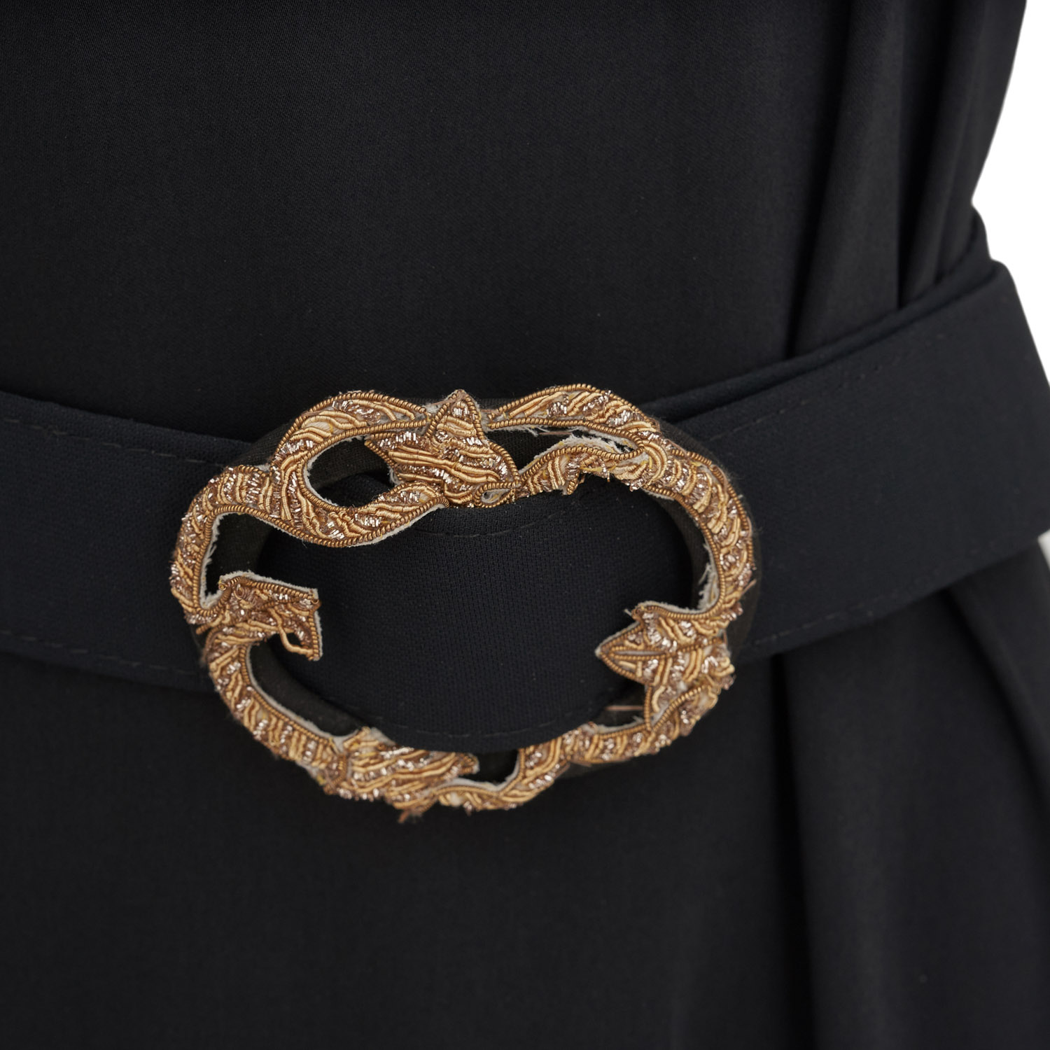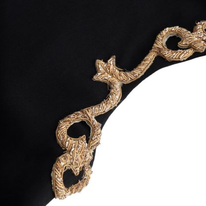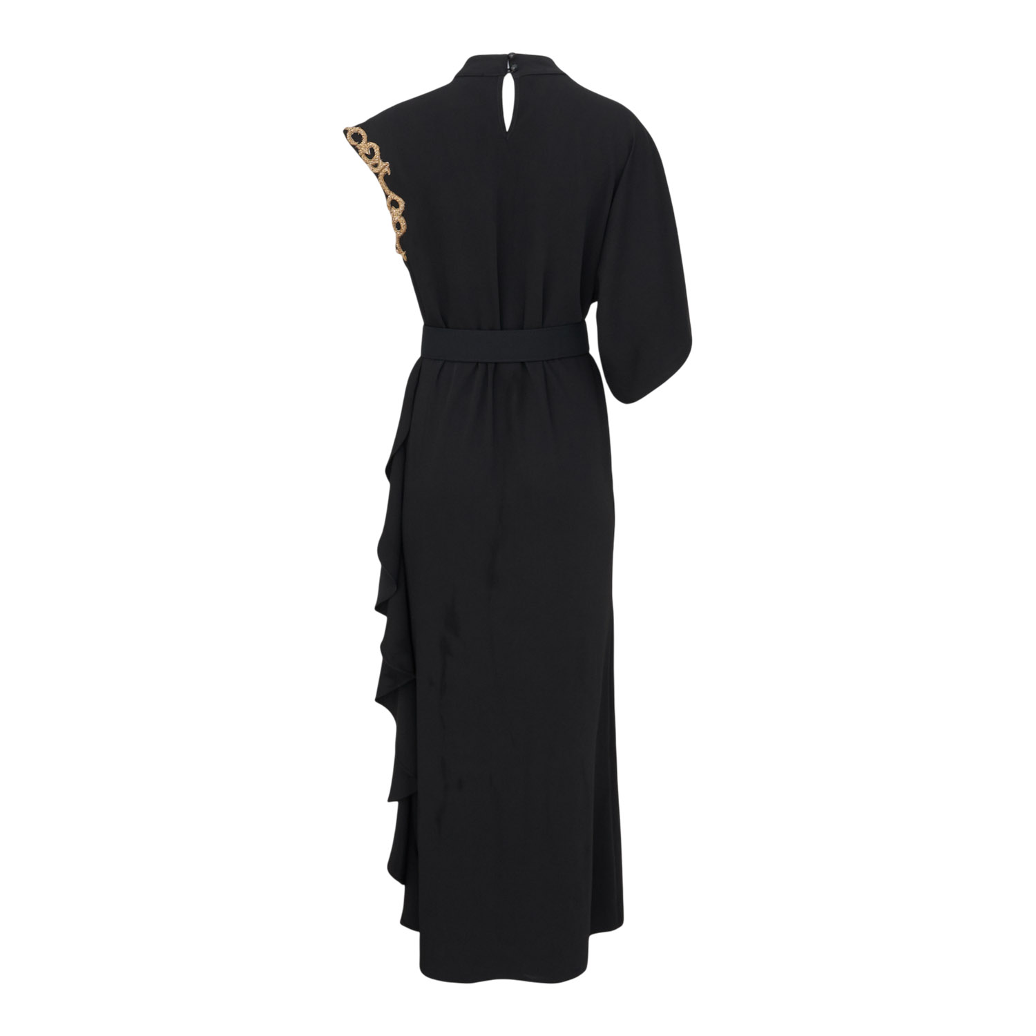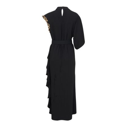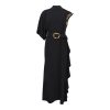 Long black dress with an asymmetric silhouette and fluid movement, elevated by striking gold details on the shoulder and waist. A true statement piece that blends architectural elegance with timeless luxury.