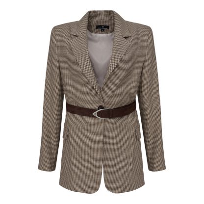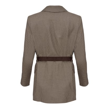 Tailored blazer in a classic pied-de-poule pattern, defined by clean lines and timeless sophistication. The waist belt enhances the silhouette, adding structure and modern elegance to a refined statement piece.