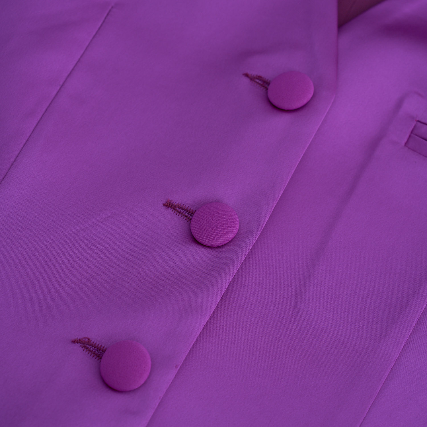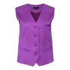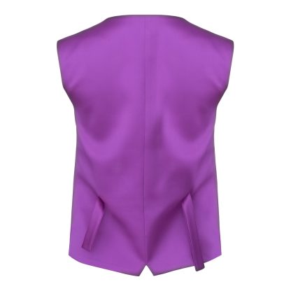 A vest with clean, tailored lines in a bold purple hue that exudes contemporary confidence. The deep V opening, covered buttons, and impeccable fit create a statement piece, ideal for dynamic layering or worn on its own as a couture choice.