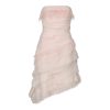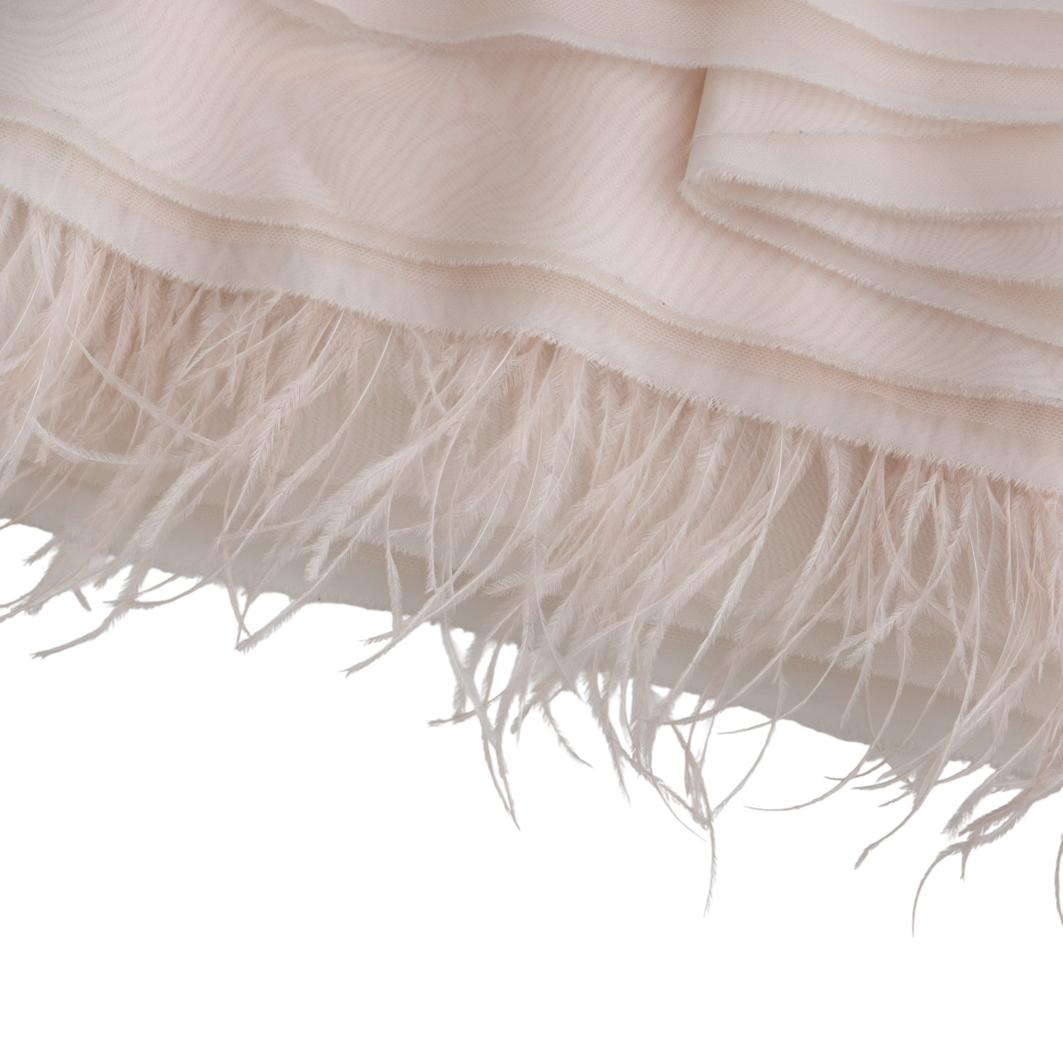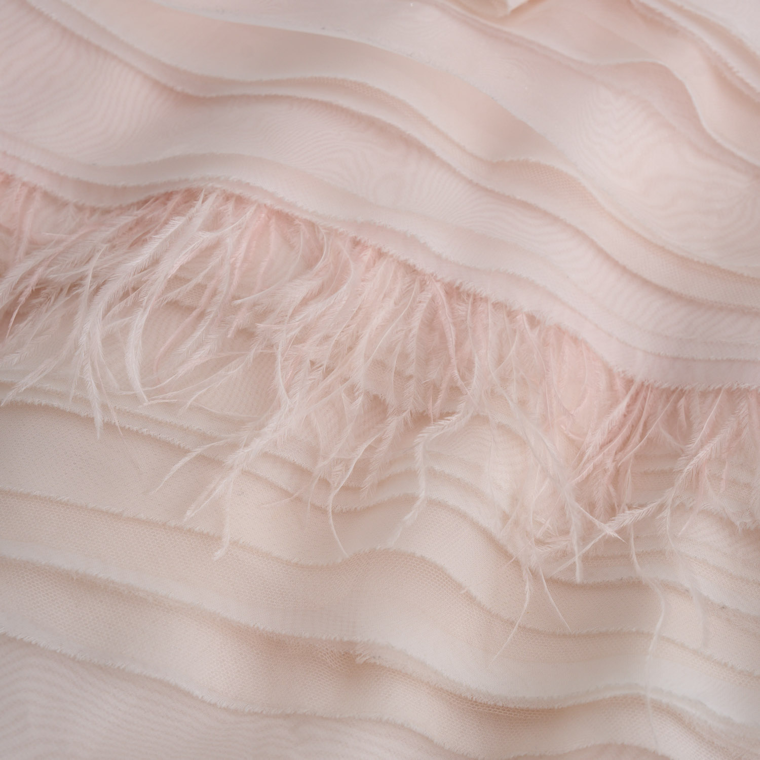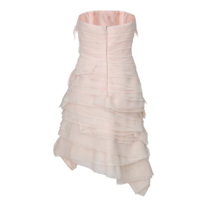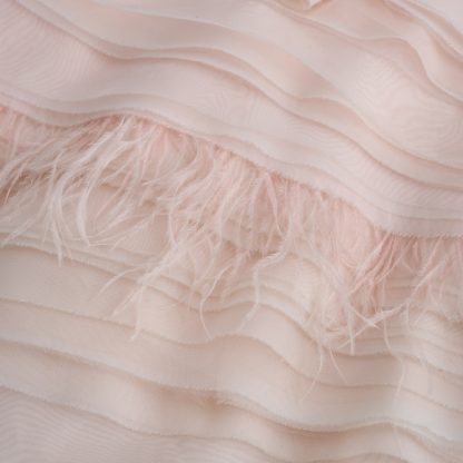 A strapless dress in a soft nude tone, featuring textured, wave-like layers of fabric and delicate feather details that add movement and a sense of ethereal luxury. The asymmetrical line and fluid texture create a couture piece of refined aesthetics, designed to move like a second skin.