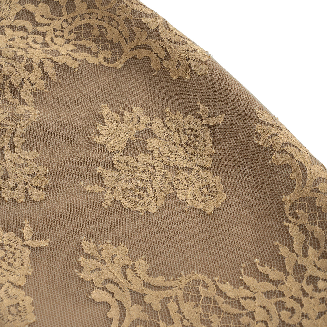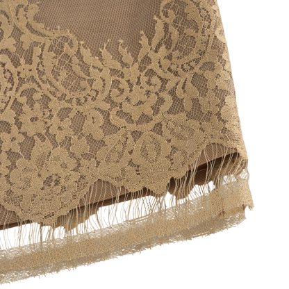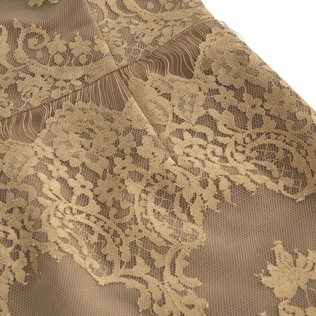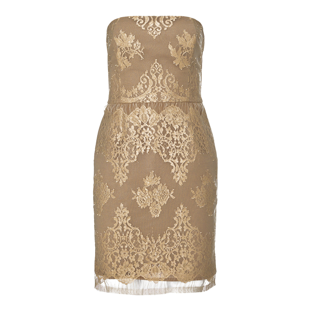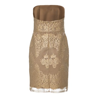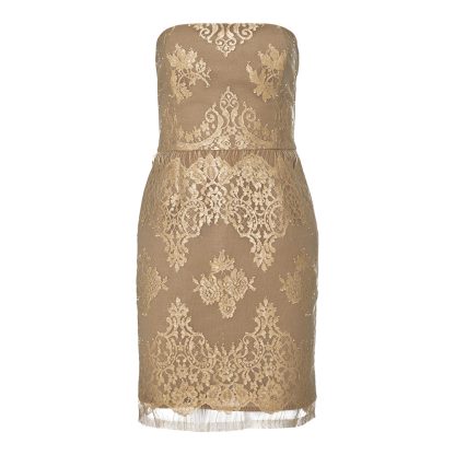 This strapless lace dress embodies timeless femininity with its golden embroidery layered over a nude base, creating a romantic and ethereal allure. Designed to highlight elegance and grace, it features a fitted silhouette, delicate lace details, and a sophisticated hemline perfect for evening occasions