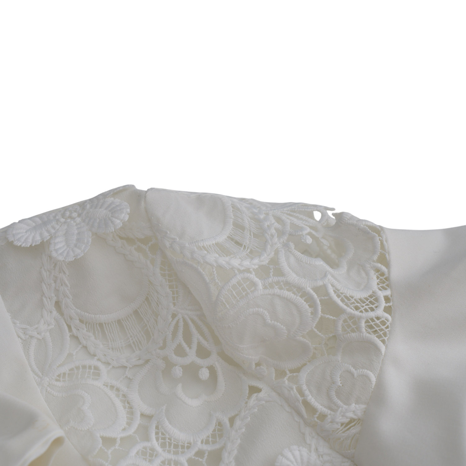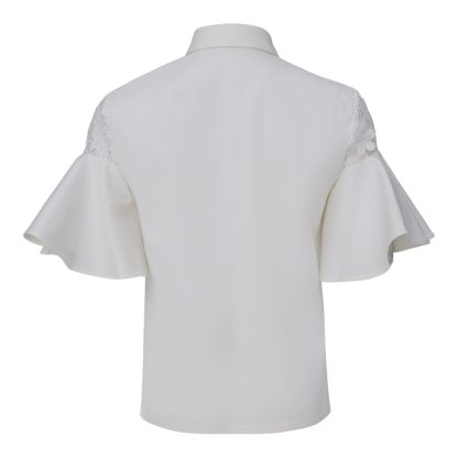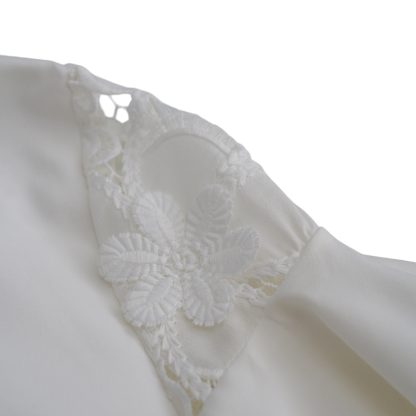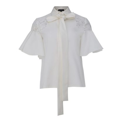 Airy blouse in an ivory shade, featuring lace details on the shoulders and a bow at the neckline that exudes timeless femininity. The lightweight sleeves add movement and romantic elegance, while the clean silhouette makes it ideal for modern luxury looks, from refined daytime styling to elegant evenings.