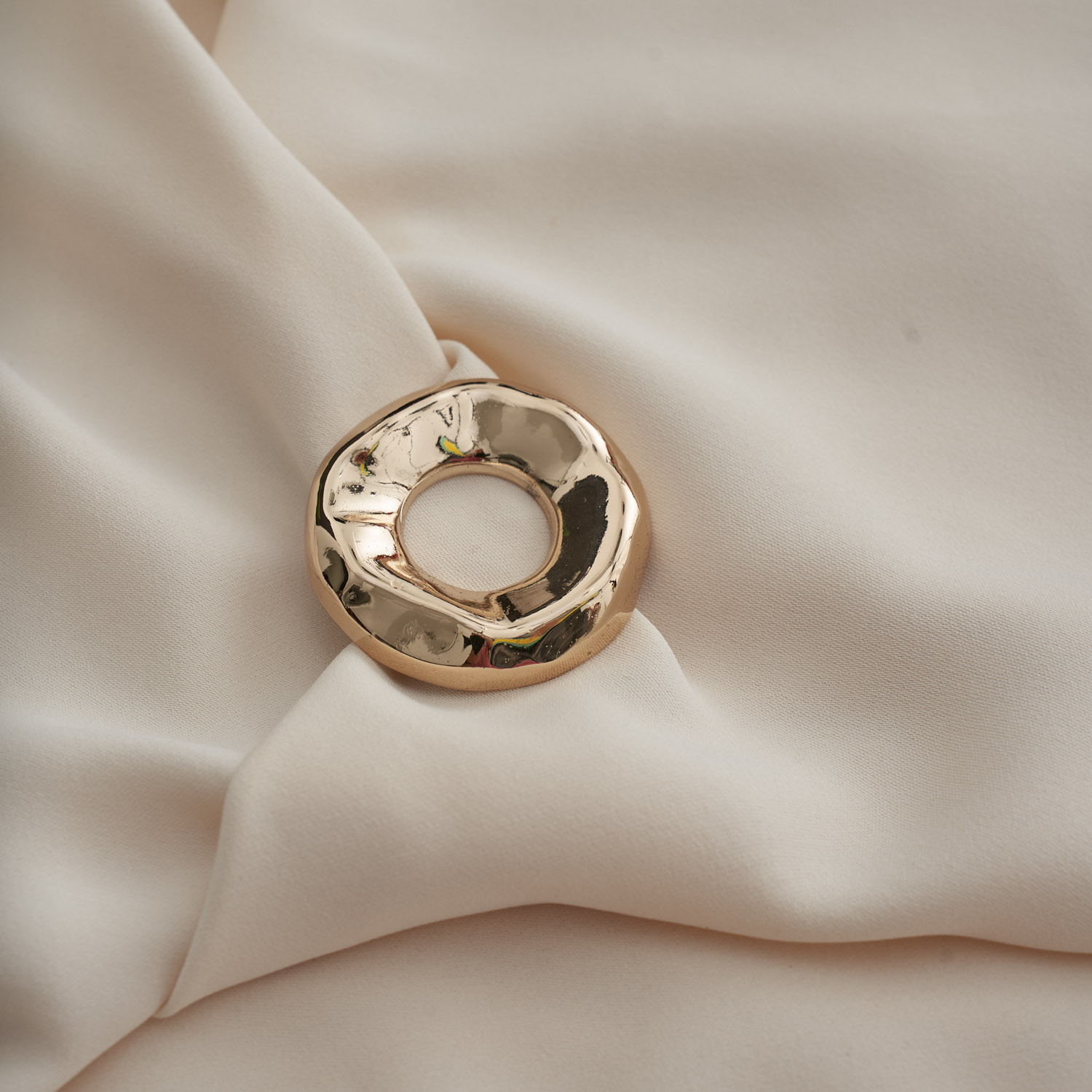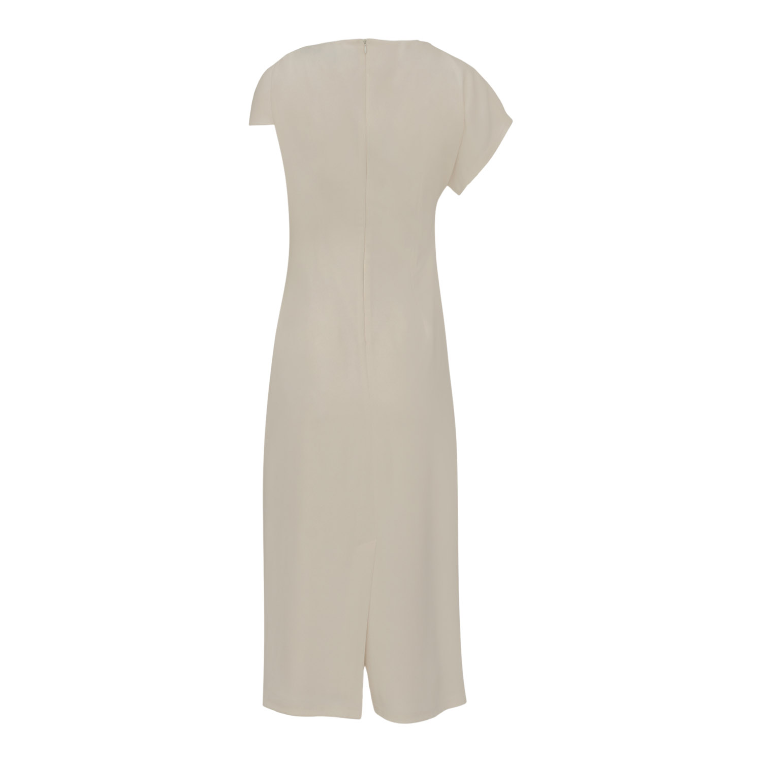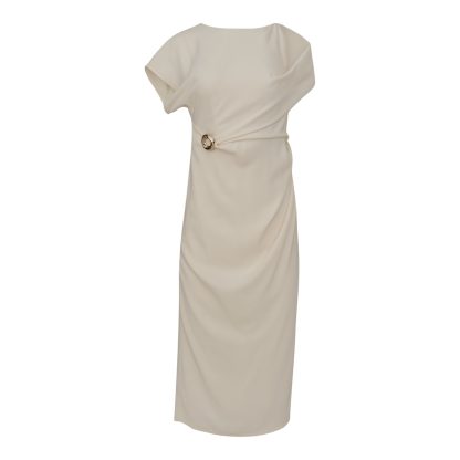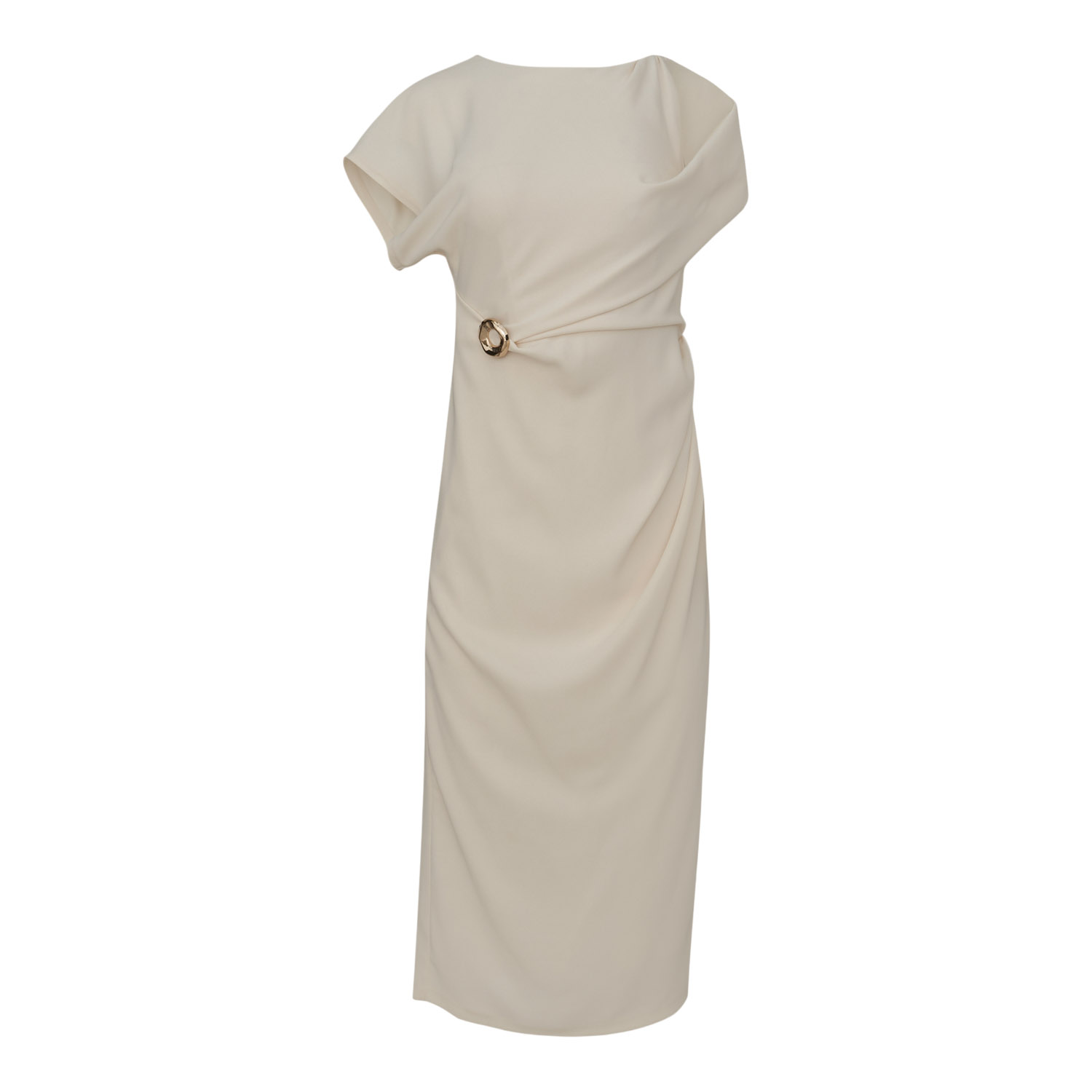 Long dress in an ecru shade, featuring an asymmetrical neckline and soft draping that gently embraces the silhouette. The metallic detail at the waist acts like a piece of jewelry, enhancing the body’s lines and adding a touch of understated luxury. A timeless and refined piece, ideal for elegant looks or special occasions.