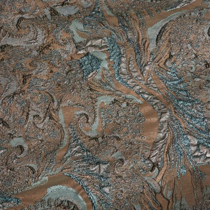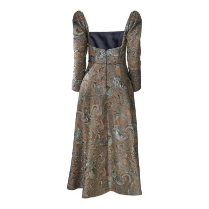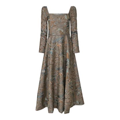 Long dress crafted from luxurious jacquard fabric with metallic gold embroidered detailing. It features a high neckline, an elegant silhouette that gently embraces the body at the upper part, and a waist belt that accentuates the figure, exuding timeless elegance and a true sense of haute couture.