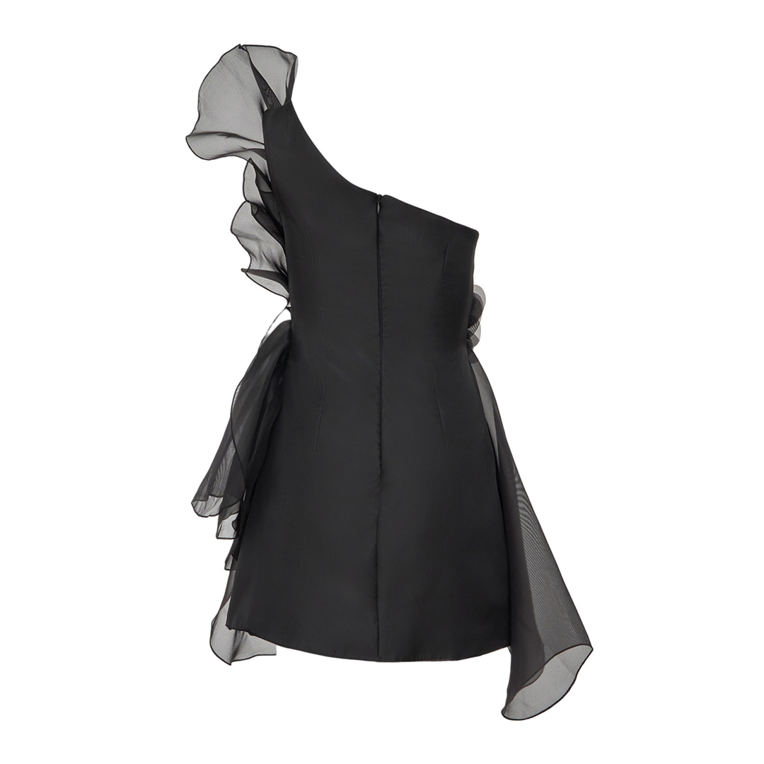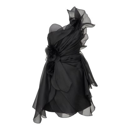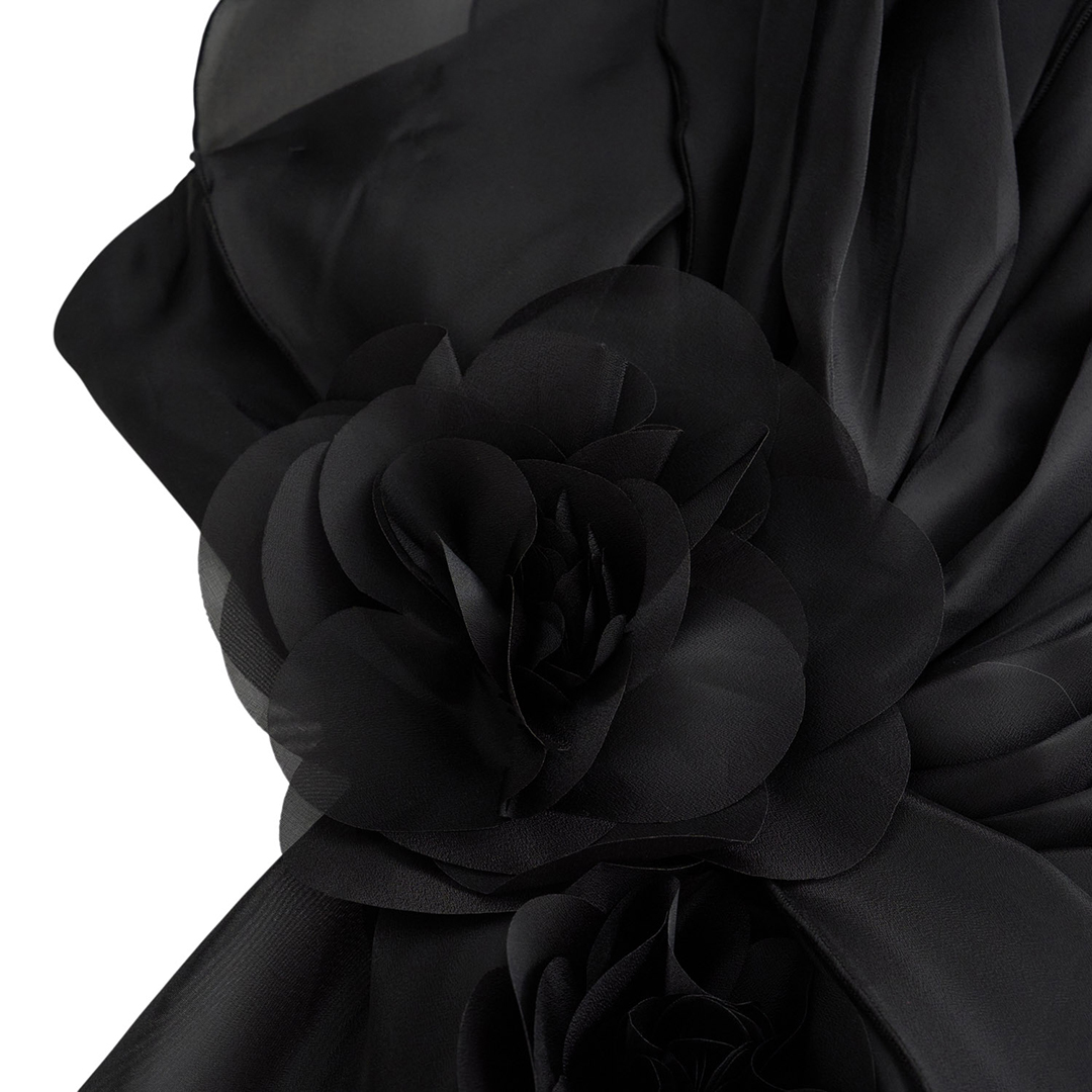 A masterpiece of haute couture, this black silk-organza dress blooms with sculptural floral appliqués and fluid draping. Designed to embrace the body with elegance and drama, it is the ultimate choice for sophisticated evening allure