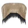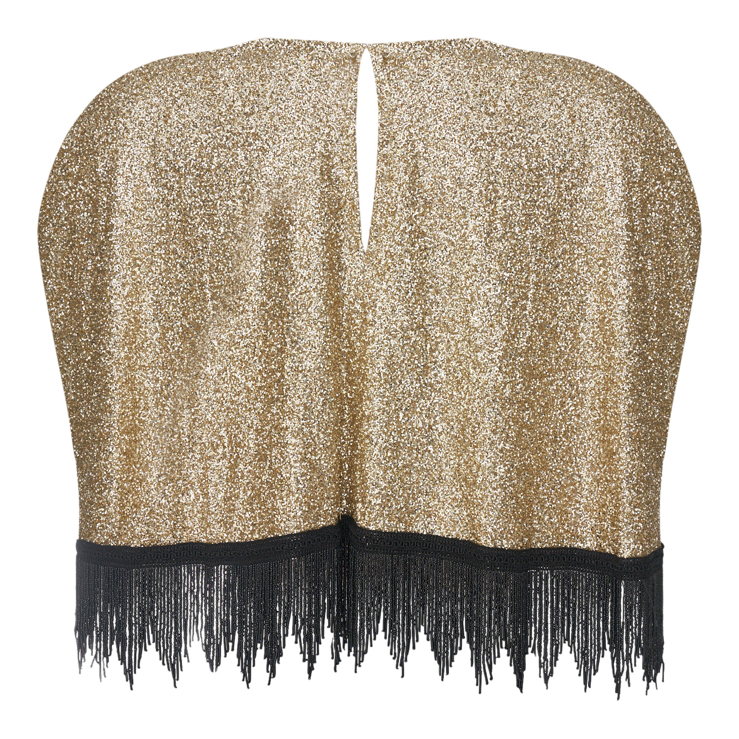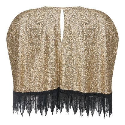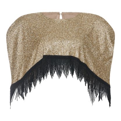 Shimmering cape with a gold-textured finish and striking black fringes at the hem, adding movement and dramatic flair. Ideal for evening looks with a couture aesthetic.