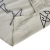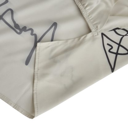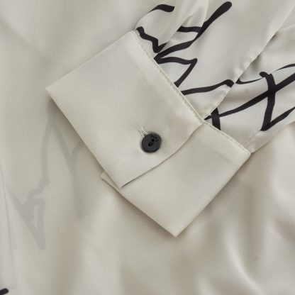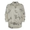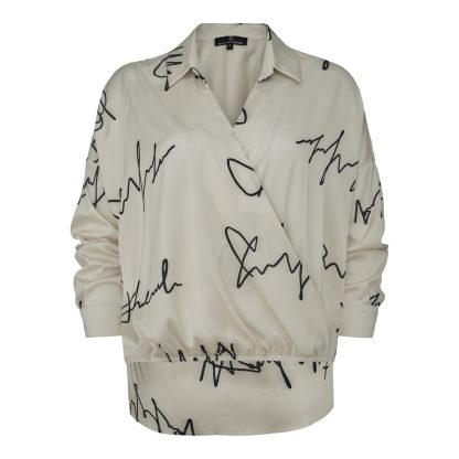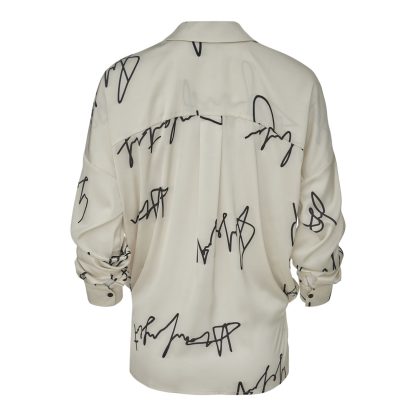 Off-white shirt featuring an artistic signature print that exudes contemporary elegance. Designed with a wrap-style front, a subtle collar, and a relaxed silhouette with gentle gathering at the waist, it is ideal for modern and refined looks.