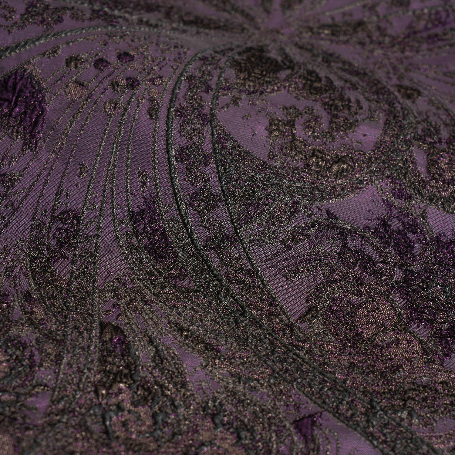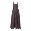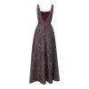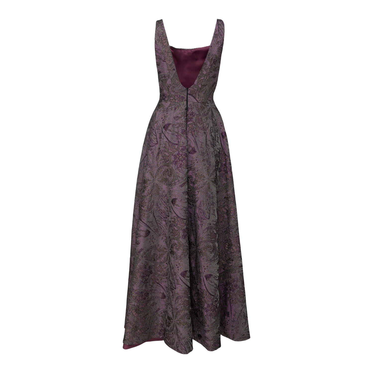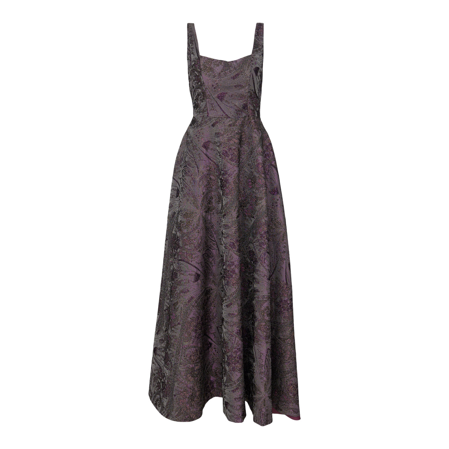 Maxi dress with straps and a feminine, fitted bodice that gently flares towards the hem. Crafted from textured jacquard fabric with purple–black metallic tones, it offers elegant movement and timeless luxury, making it ideal for evening and formal occasions.